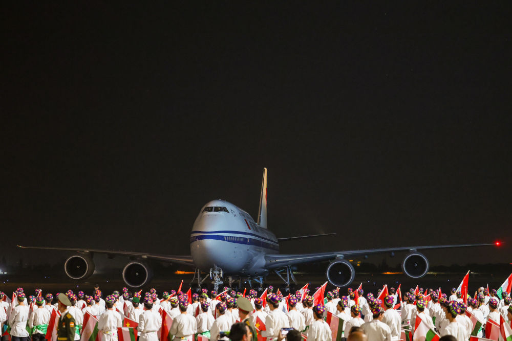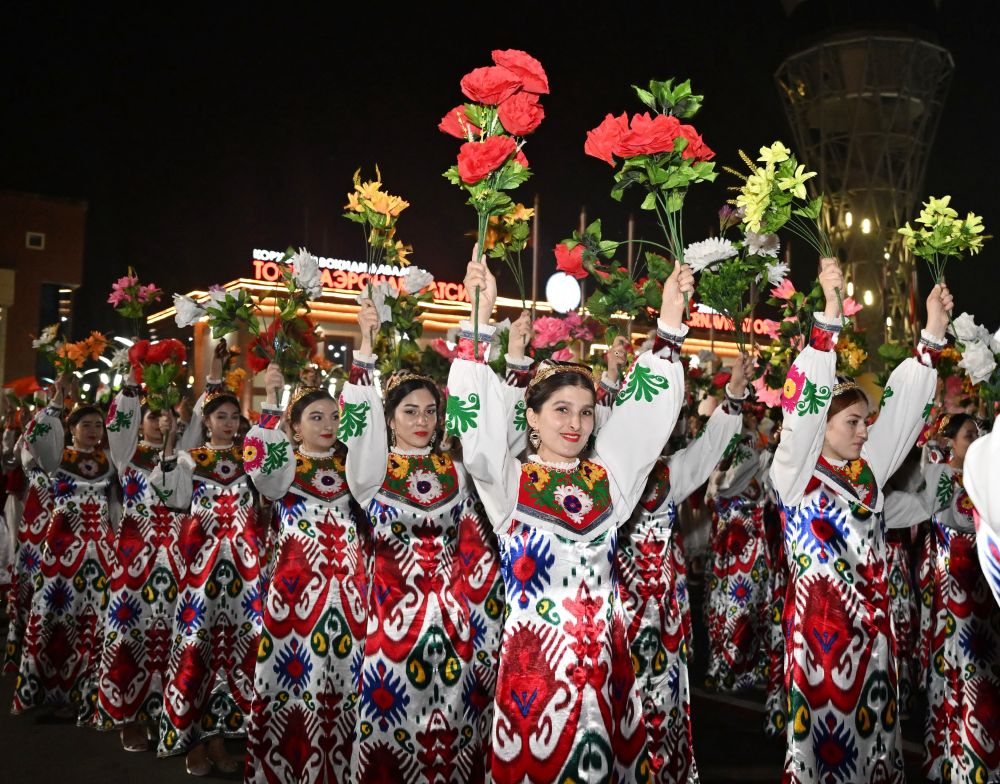 拉赫蒙在機場為習近平舉行盛大隆重的迎賓儀式。1500多名身著民族盛裝的塔吉克斯坦青年表演富有濃郁特色的中塔歌舞,揮舞中塔兩國國旗,表達對中國最尊貴客人的熱烈歡迎。