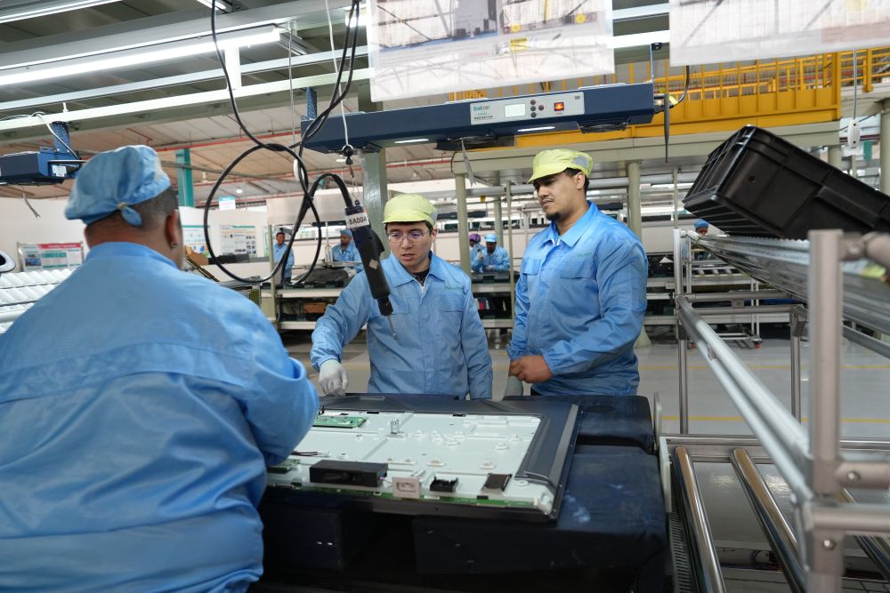 2024年8月14日,中方工程師(中)在南非開普敦的海信南非工業園電視機生產線上指導當地員工工作。工業園已為當地創造1000多個直接就業機會、5000多個間接就業崗位,帶動地區產業鏈發展。