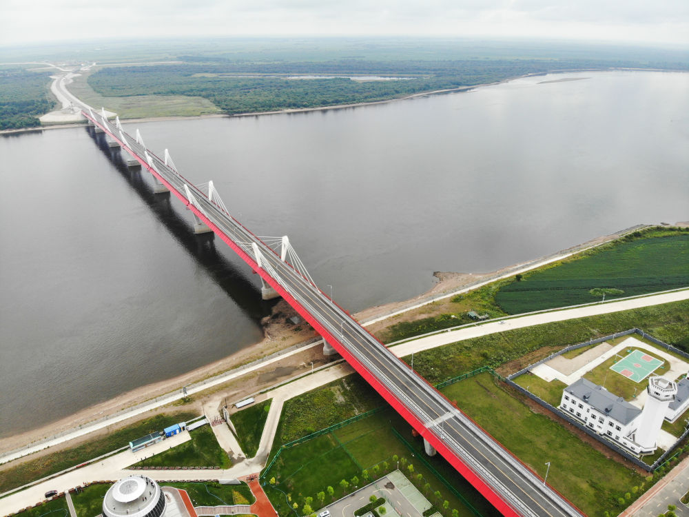 這是在中國黑河一側拍攝的黑河-布拉戈維申斯克公路橋(2023年8月11日攝,無人機照片)。2022年6月10日,這座中俄首座跨黑龍江公路大橋正式通車,在中國東北地區和俄羅斯遠東地區之間開辟了新的國際運輸通道。