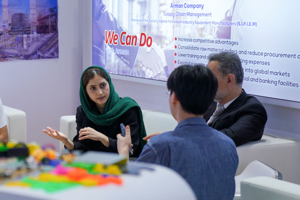 2024年9月15日,在位于北京的服貿會國家會議中心展區,來自伊朗的參展商與中方參展人員交流。2024年一季度我國對伊朗市場采購出口同比增長15.2%。