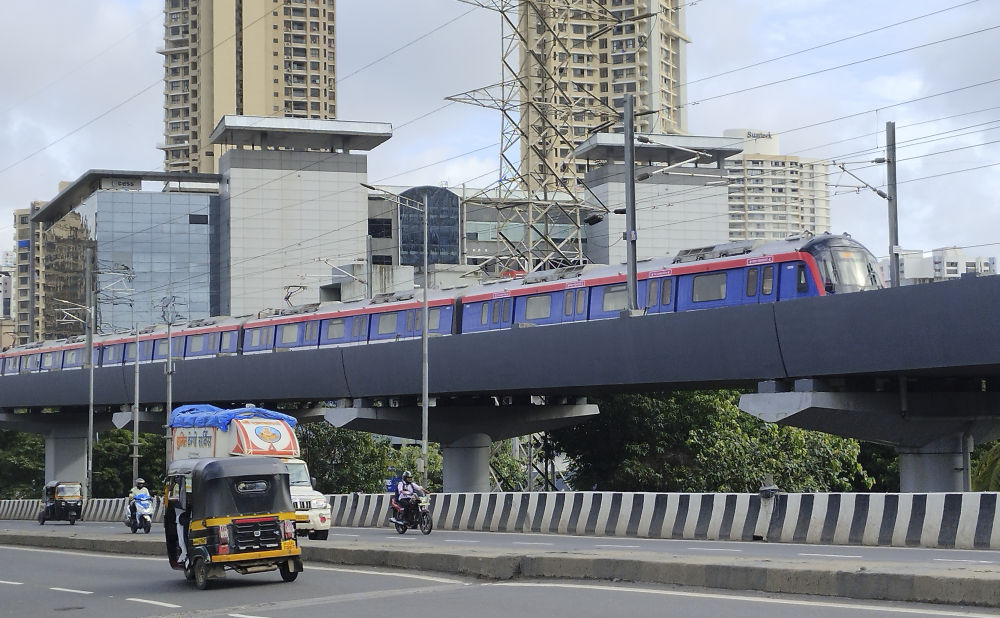這是在印度孟買北部已開通運行路段拍攝的地鐵列車(2022年6月22日攝)。新開發銀行向印度孟買北部地鐵項目提供了貸款,項目第一部分已于2022年4月開通運營,緩解了沿線地區的城市交通壓力。新華社發(阿西夫攝)