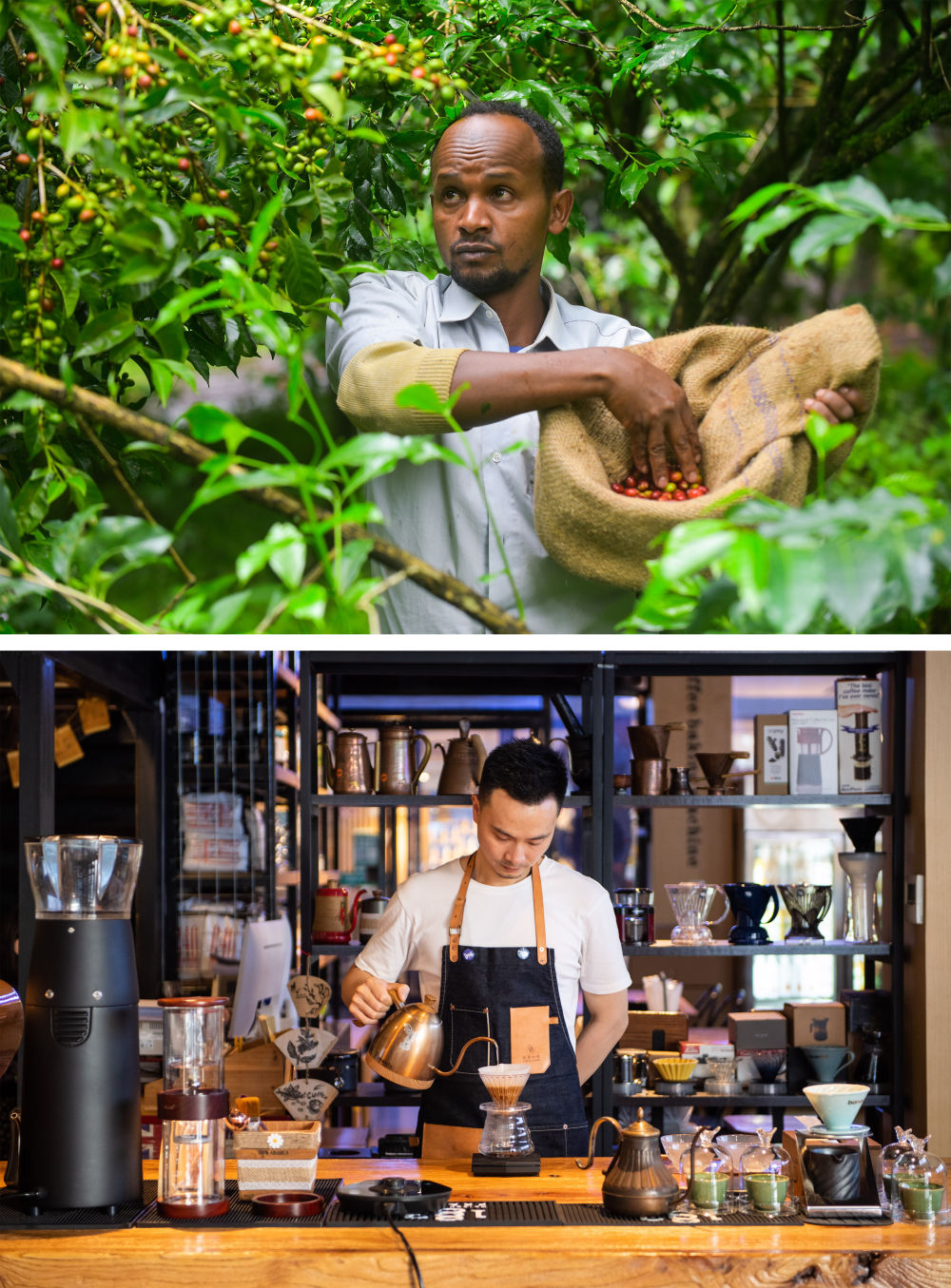 上圖:2021年9月22日,在埃塞俄比亞奧羅米亞州戈馬地區的一個咖啡園,農民胡森·穆罕默德在采摘咖啡豆;下圖:2021年9月24日,在湖南省長沙市高橋大市場非洲咖啡街一家咖啡館,咖啡師彭杰在制作咖啡飲品。隨著中國開放的大門越開越大、中國咖啡消費的快速增長,埃塞俄比亞咖啡在中國越來越受歡迎。