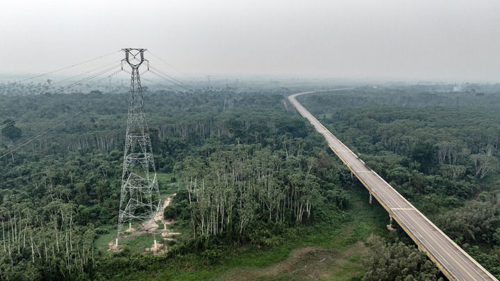 這張2024年9月13日拍攝的照片顯示,在巴西朗多尼亞州,EDP輸變電項目線路穿越熱帶雨林(無人機照片)。巴西EDP輸變電項目是位于巴西北部的阿克里州和朗多尼亞州的綠地輸變電工程,山東電建一公司承擔了該項目的EPC總承包任務。項目全面完成后,將極大提升當地電網的輸電能力,增強電力供應的可靠性和穩定性,對巴西北部地區的可持續發展和經濟增長具有重要意義。新華社記者 王天聰 攝