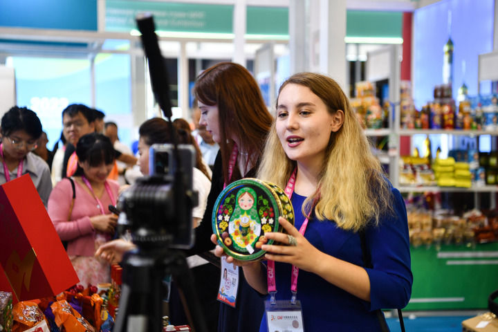 2023年9月19日,來自俄羅斯的參展商在中國陜西楊凌農高會展臺進行直播。新華社記者 張博文 攝