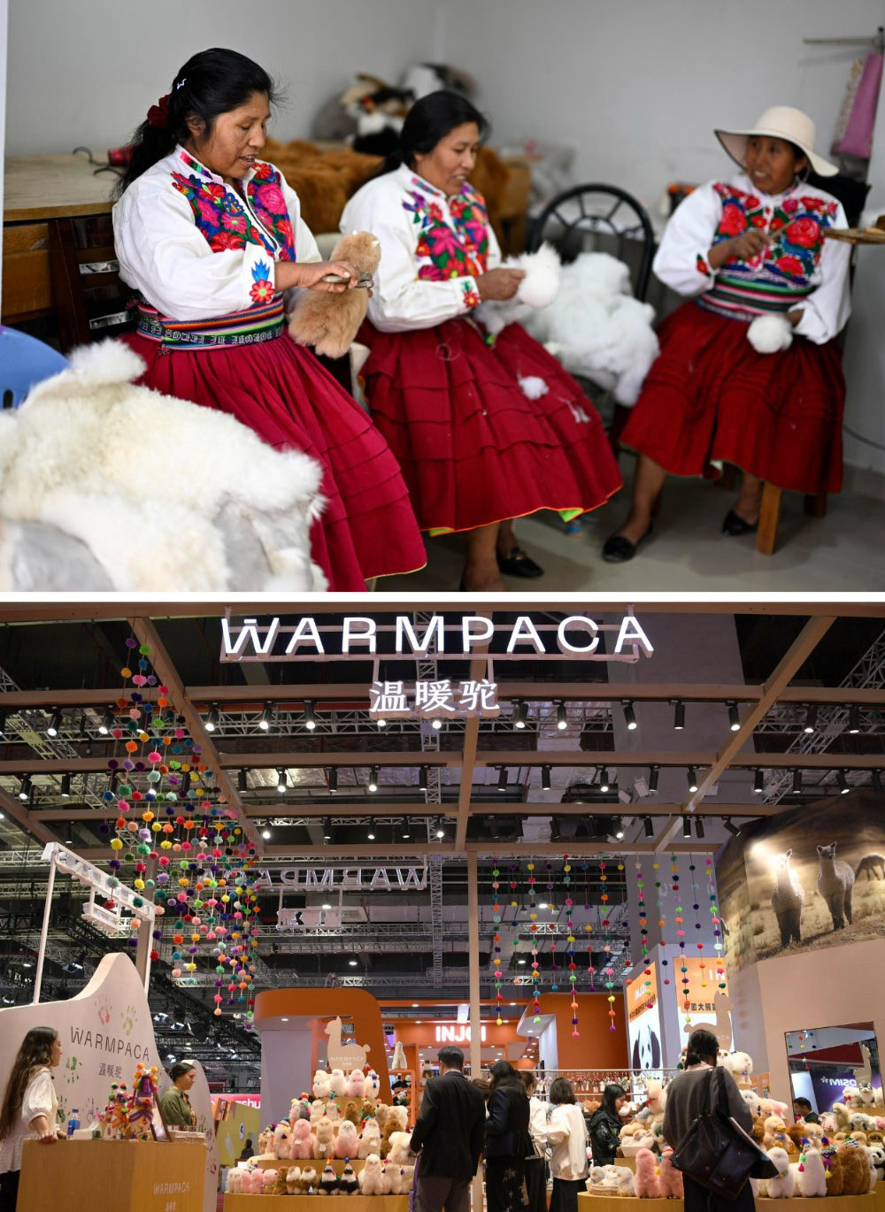 2016年,中國姑娘馬玉霞在秘魯阿雷基帕街邊市場購買了秘魯羊駝毛制品手工藝人奧斯瓦爾多·馬馬尼的羊駝毛玩偶并引入中國市場。通過連續參展進博會,羊駝毛制品在中國市場大受歡迎,并創立了中文品牌“溫暖駝”。今年,秘魯品牌“溫暖駝”連續第七年亮相進博會,受到更多中國消費者的喜愛。目前,“溫暖駝”品牌已入駐國內30多家商場,并且開拓了電商平臺線上銷售,年銷量超過3萬只。上圖:2024年6月20日,在秘魯阿雷基帕,工作人員在羊駝毛制品手工藝人奧斯瓦爾多·馬馬尼的工坊制作羊駝玩偶。下圖:2024年11月5日在上海拍攝的第七屆進博會秘魯“溫暖駝”展臺。