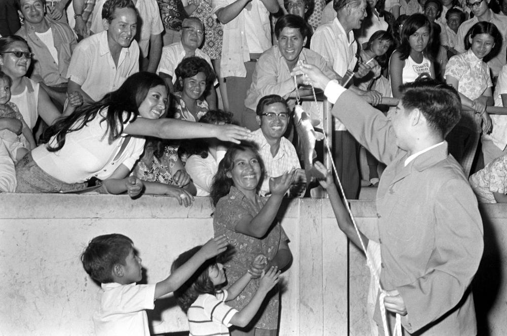 1973年2月,沈陽雜技團赴秘魯進行友好訪問演出。這是演員劉忠表演魔術《釣魚》,受到秘魯觀眾的熱烈歡迎。