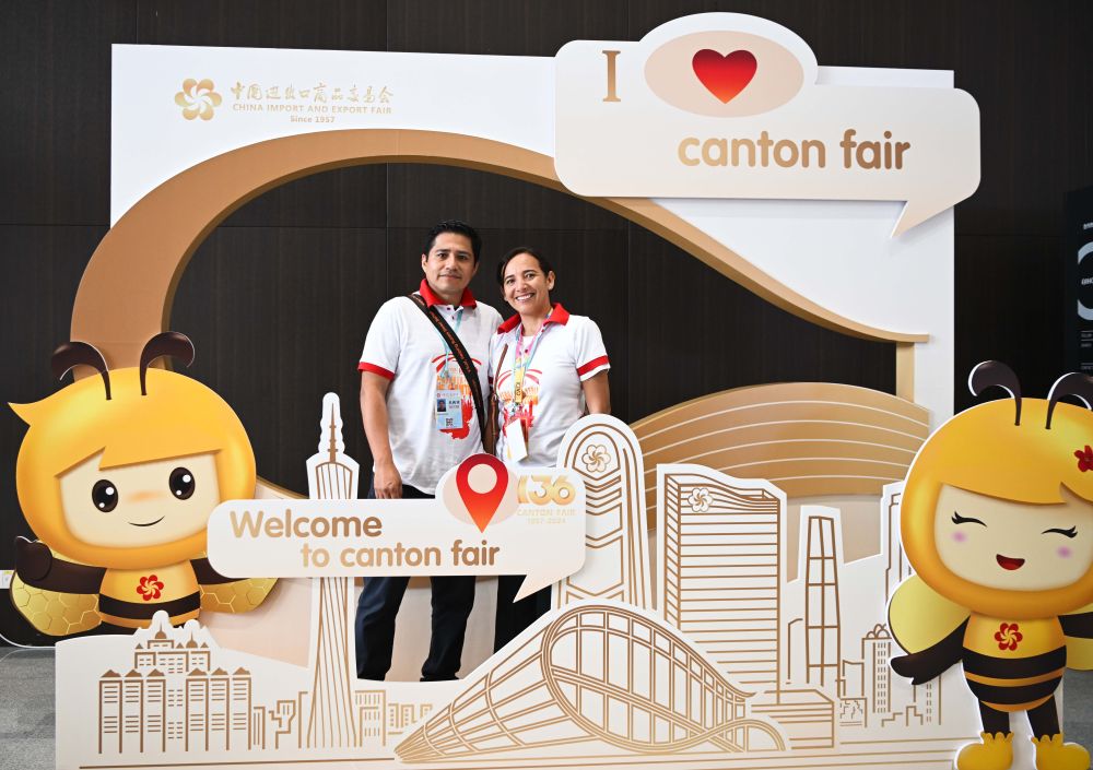 2024年10月15日,來自秘魯的采購商在廣州舉行的廣交會上合影留念。