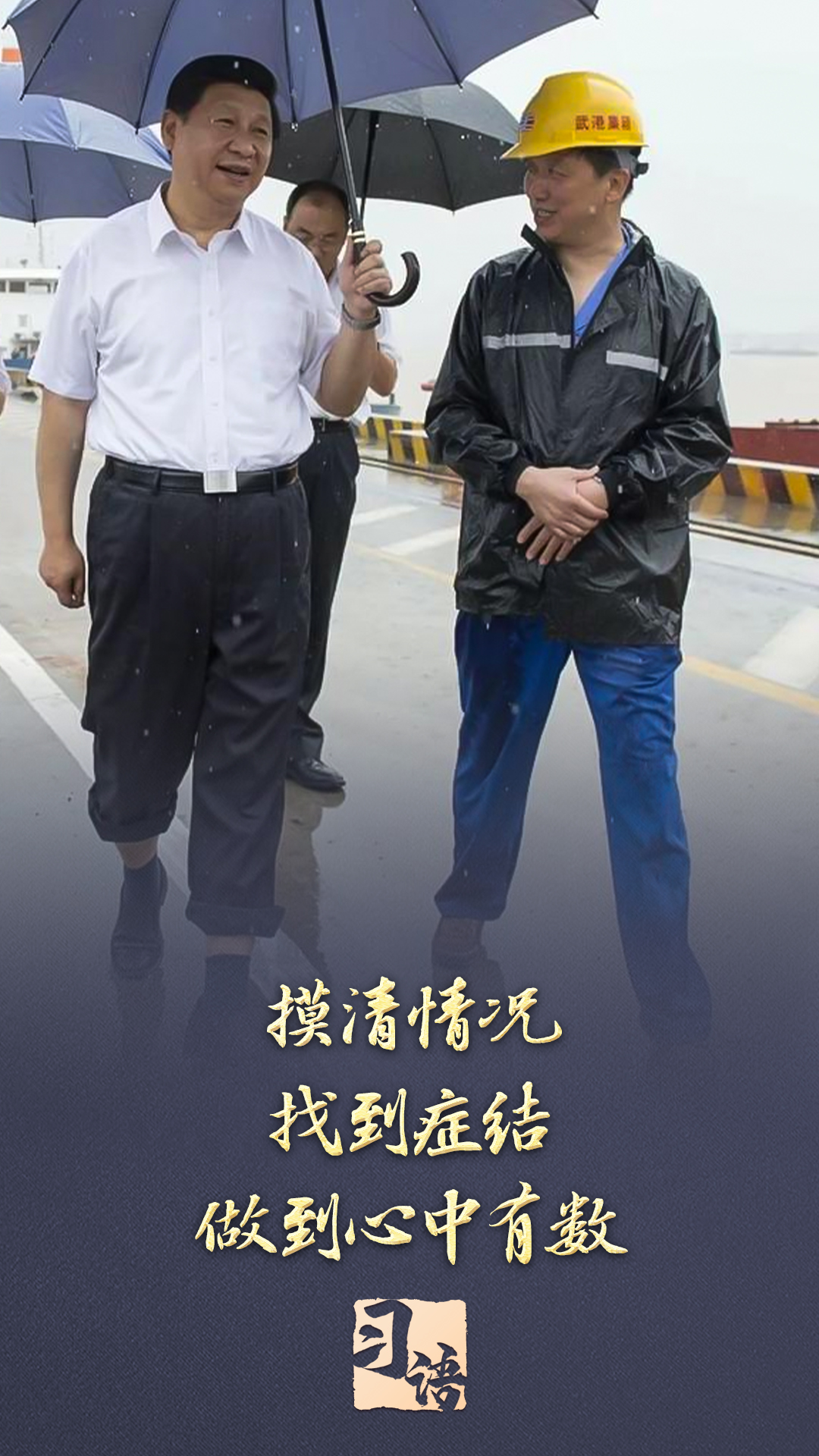 2013年7月,習(xí)近平總書記冒雨來到湖北武漢新港陽邏集裝箱港區(qū)考察,他卷起褲腿,打著雨傘,蹚著積水邊走邊看邊問。兩天后,在武漢主持召開部分省市負(fù)責(zé)人座談會(huì)時(shí),習(xí)近平總書記強(qiáng)調(diào):“研究、思考、確定全面深化改革的思路和重大舉措,刻舟求劍不行,閉門造車不行,異想天開更不行,必須進(jìn)行全面深入的調(diào)查研究。”