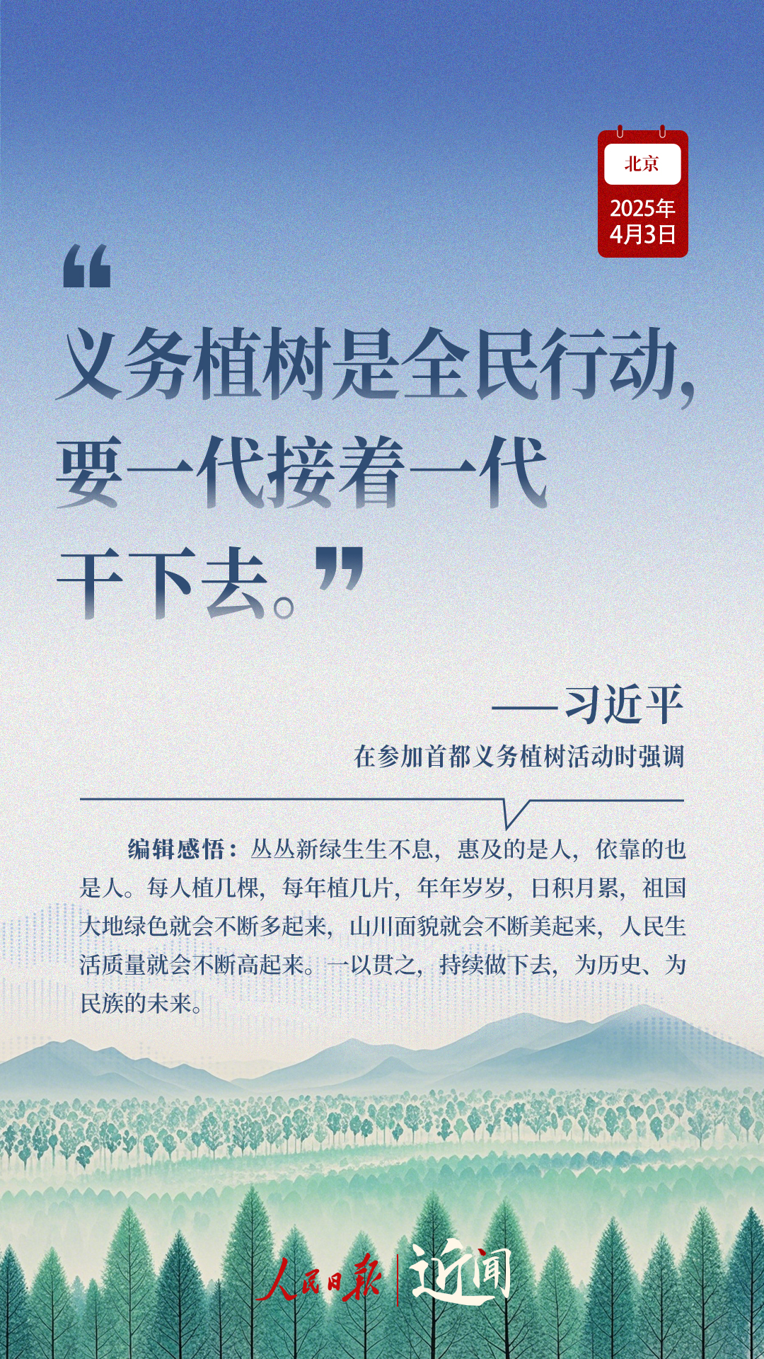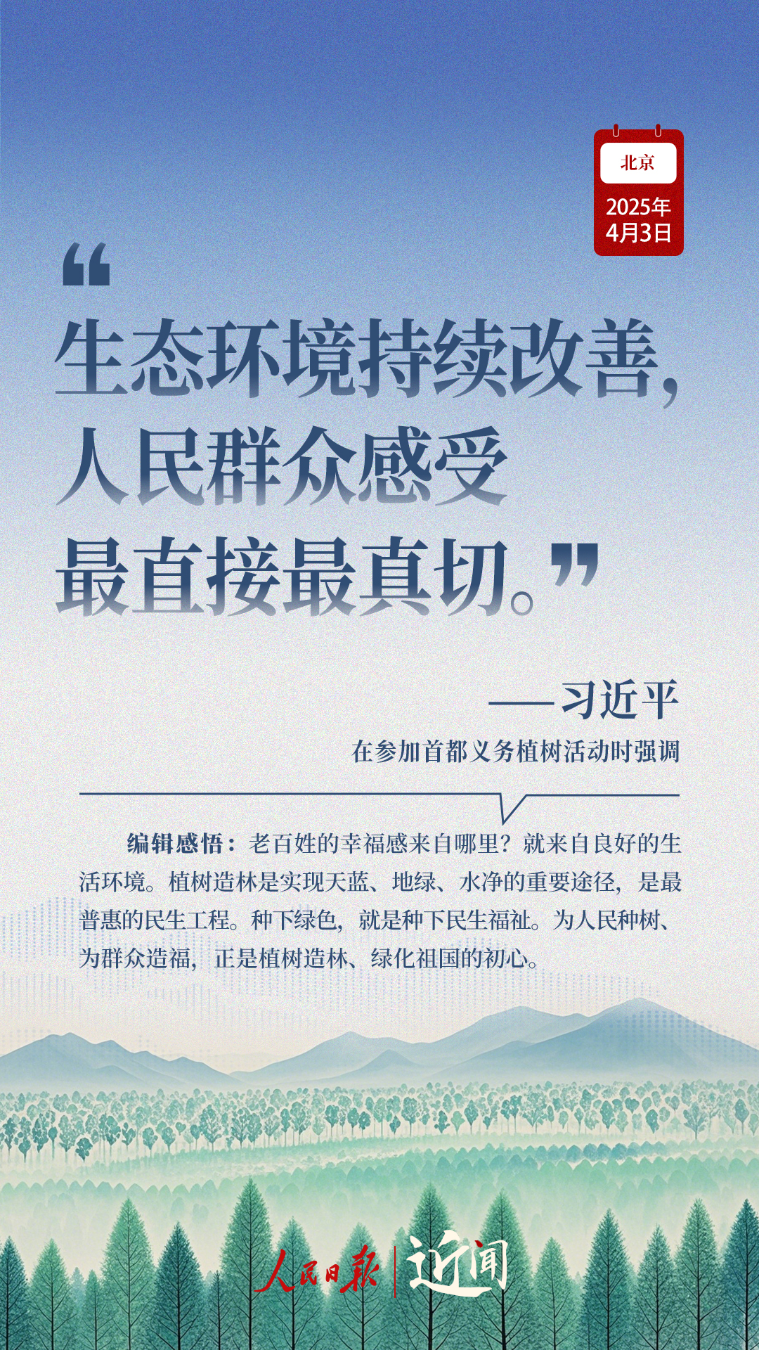 “生態環境持續改善,人民群眾感受最直接最真切。”“義務植樹是全民行動,要一代接著一代干下去。”在植樹現場,從這些話語讀懂一份堅持、一種情懷。
