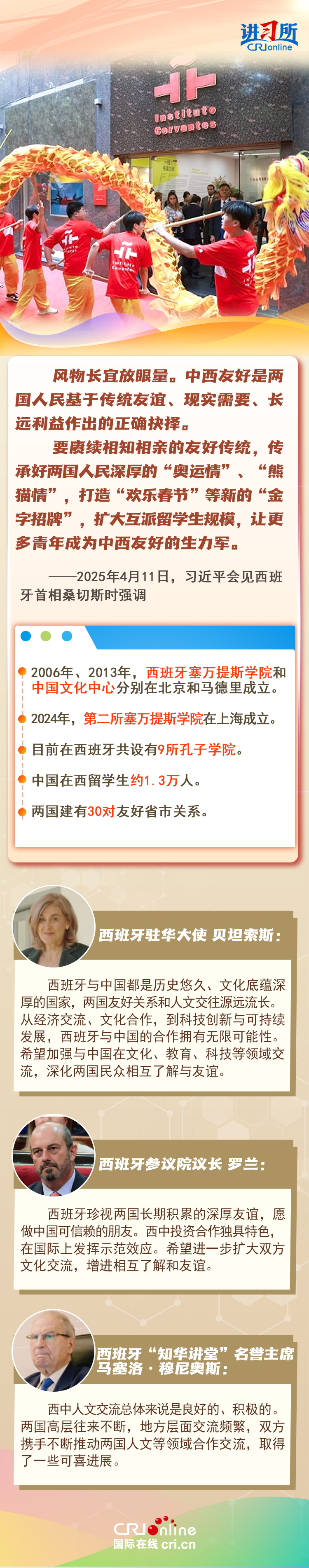 今年是中西全面戰略伙伴關系建立20周年,也是中歐建交50周年。多年來,中西兩國領導人保持密切互動,秉持互尊互信、互利共贏精神,兩國在深化貿易、投資、科技創新、綠色能源等領域取得豐富合作成果,雙邊關系走在中國同歐洲國家關系前列。在西班牙人士眼中,良好的對華關系對西班牙、歐洲和世界具有重要意義,將會為兩國人民帶來更多實實在在的福祉,也將共同創造更美好的未來。