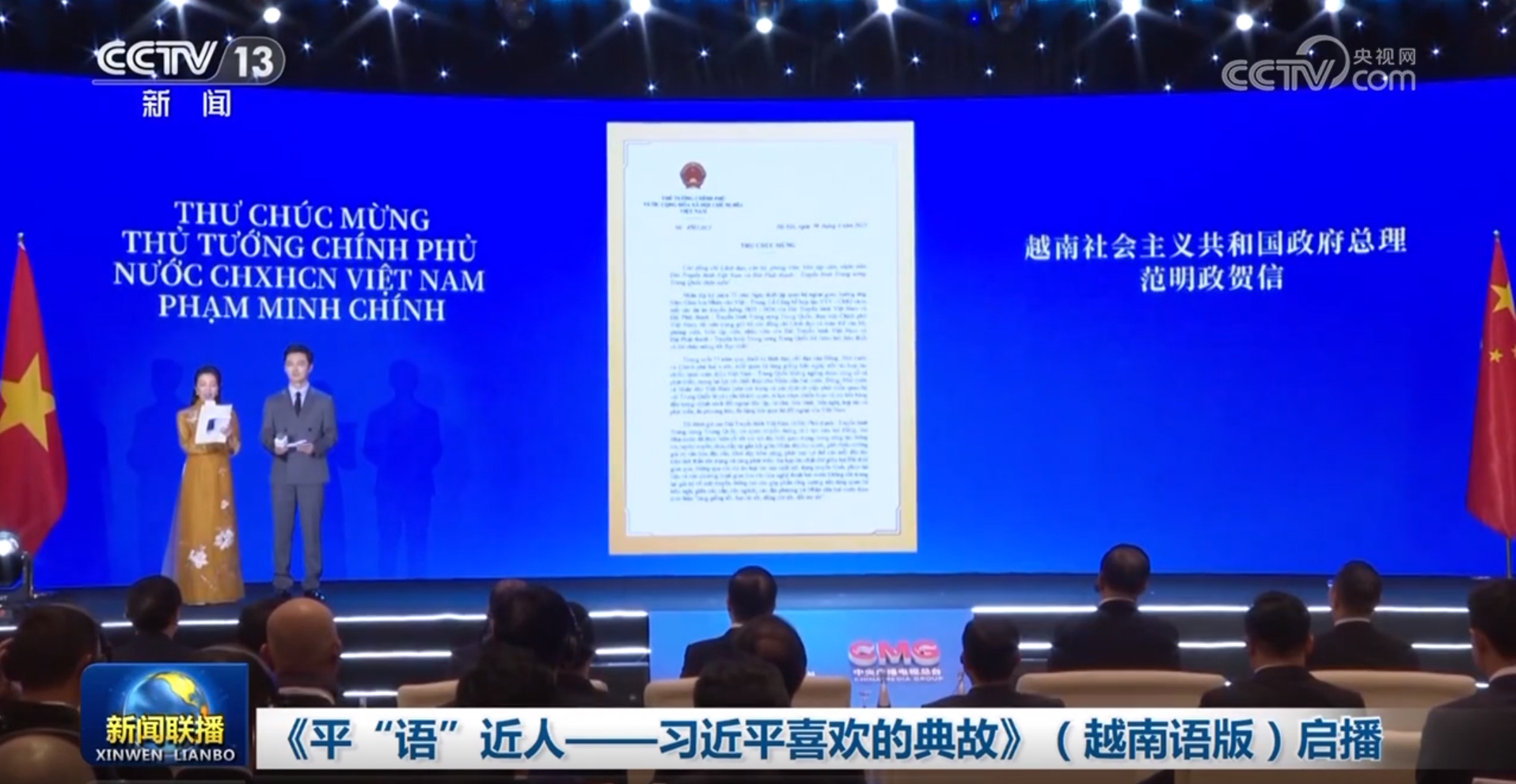 在中共中央總書記、國家主席習近平對越南進行國事訪問之際,4月14日,由中國中央廣播電視總臺制作的《平“語”近人——習近平喜歡的典故》(越南語版)在越南啟播。慶祝中越建交75周年人文交流活動同日在河內舉行。越南總理范明政致賀信,對節目播出和活動成功舉辦表示祝賀。