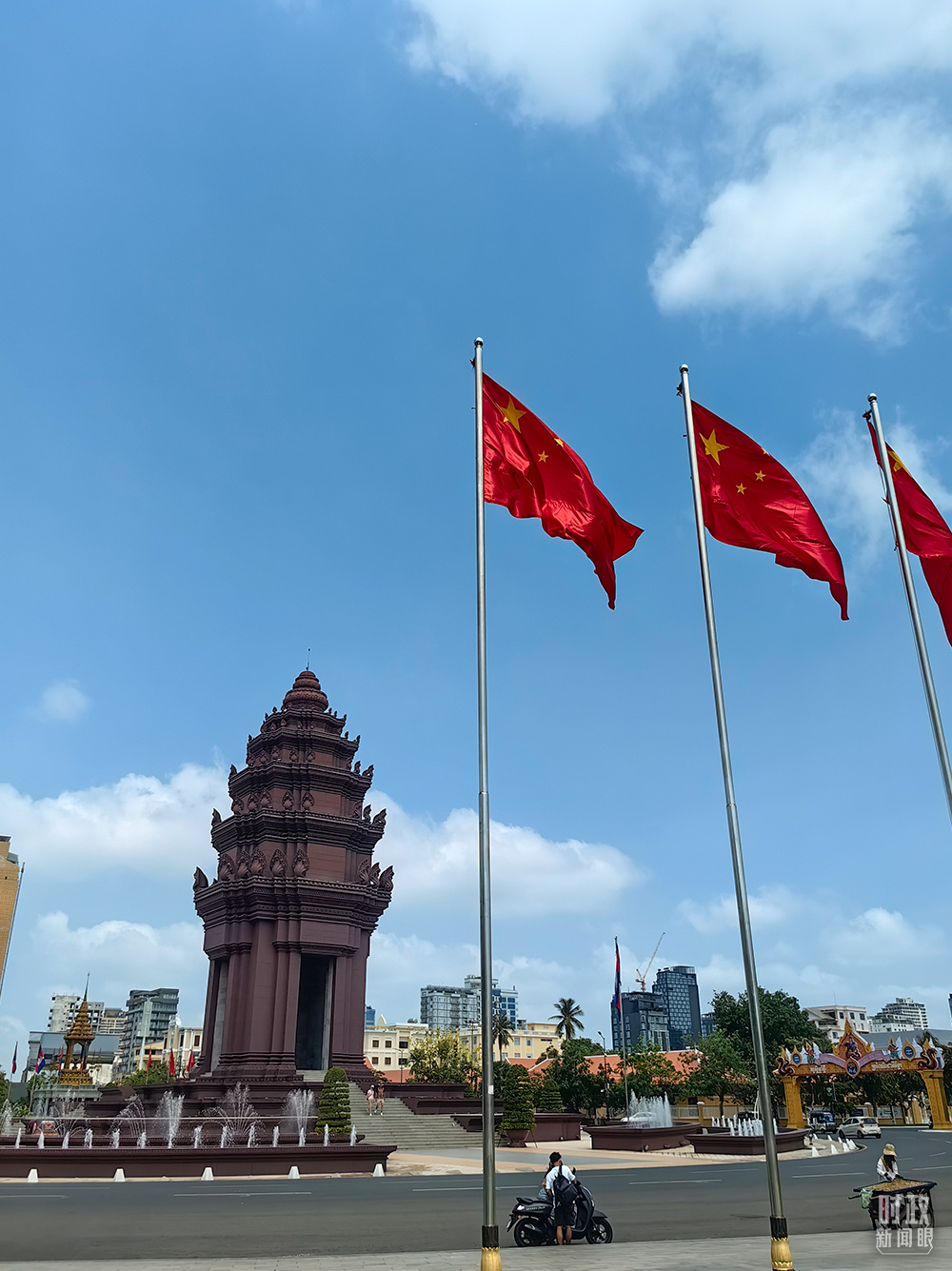 △柬埔寨獨立紀念碑前懸掛的中國國旗。(總臺央視記者段德文拍攝)