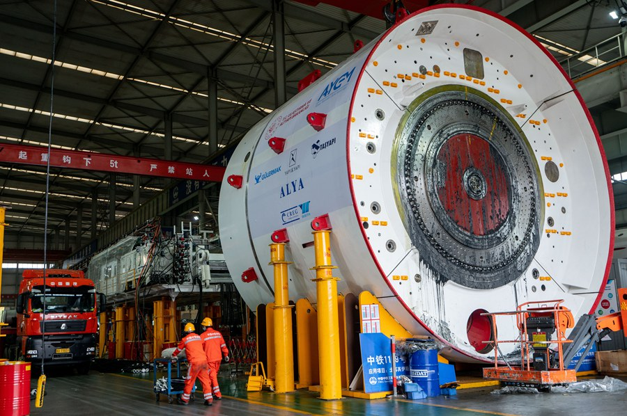 2022年11月23日,工人在中鐵裝備集團車間內運輸掘進機零部件。新華社發