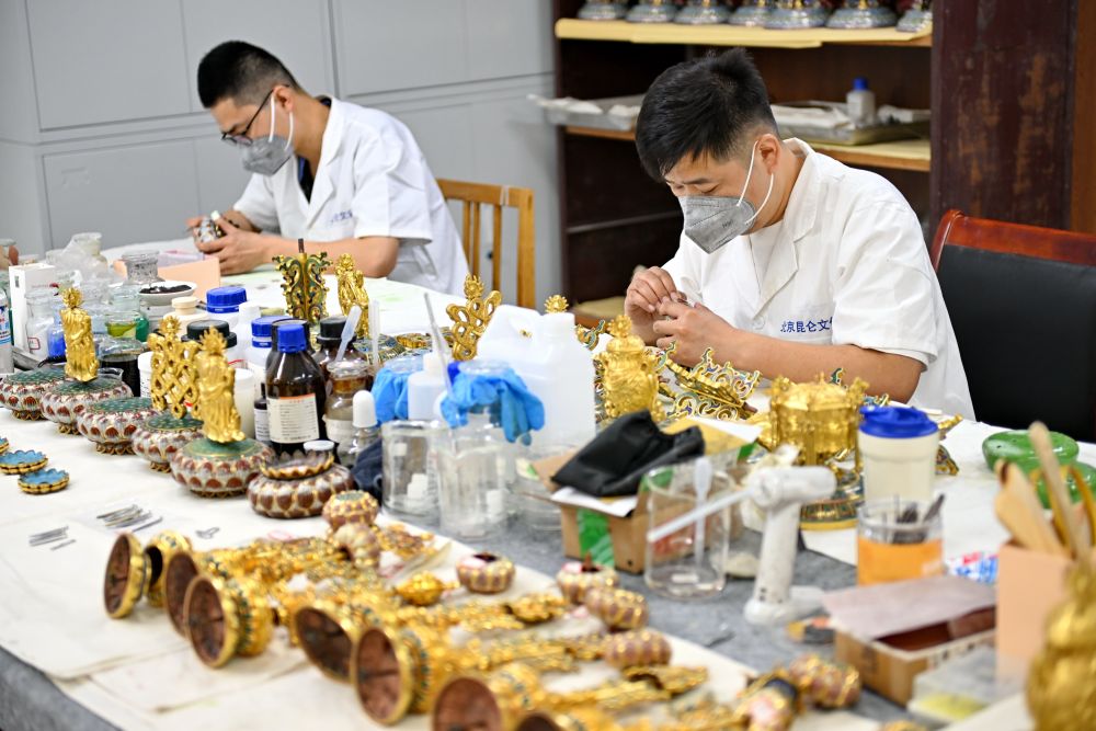 2025年5月30日,文保工作人員在承德避暑山莊博物院修復(fù)琺瑯器。