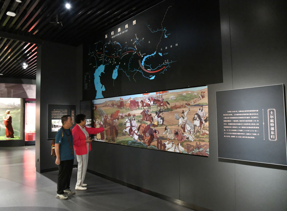 2025年6月4日,游客在承德博物館參觀土爾扈特部東歸的示意圖。2021年,習(xí)近平總書記在承德博物館考察期間曾感慨:“土爾扈特部都去了100多年了,最終還是義無(wú)反顧要回到祖國(guó),這真正體現(xiàn)了我們中華民族的影響力和向心力。”