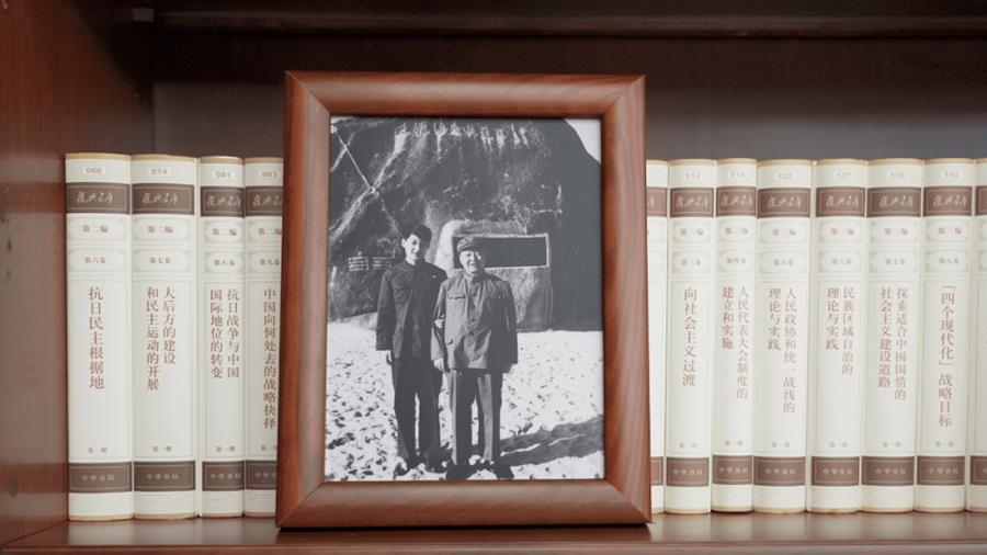 △2022年12月31日,習(xí)近平總書記辦公室的書架上擺放著他和父親的合影。