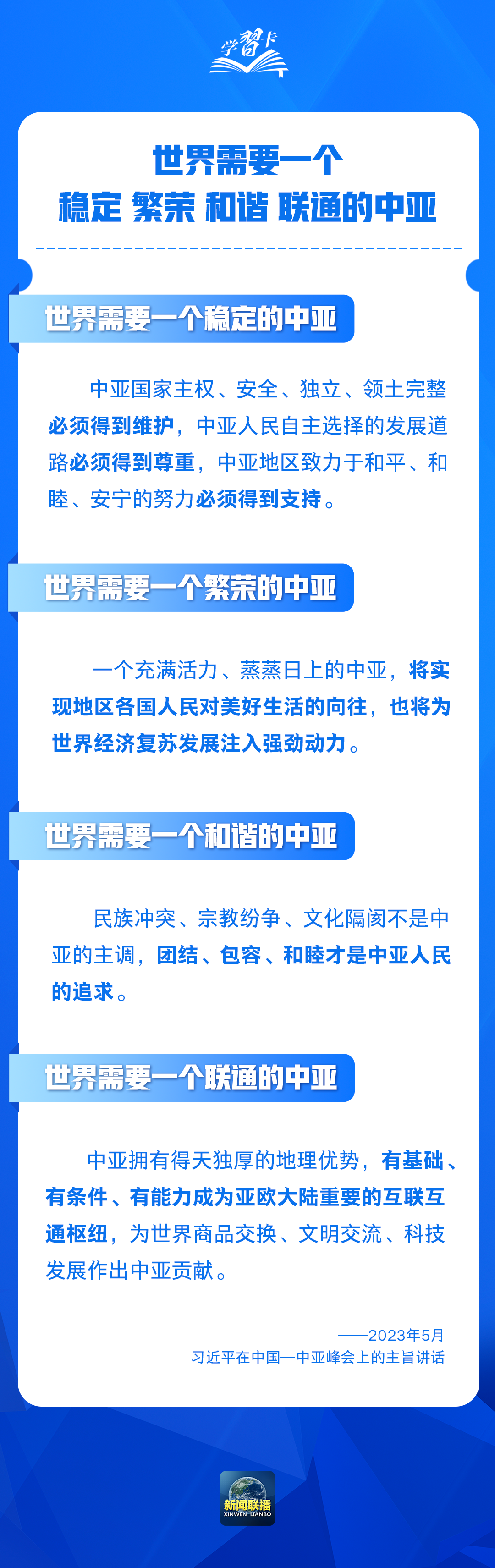 中亞是亞歐大陸的中心,處在聯通東西、貫穿南北的十字路口。習近平主席強調,深化中國—中亞合作,是我們這代領導人著眼未來作出的戰略抉擇,順應世界大勢,符合人民期盼。