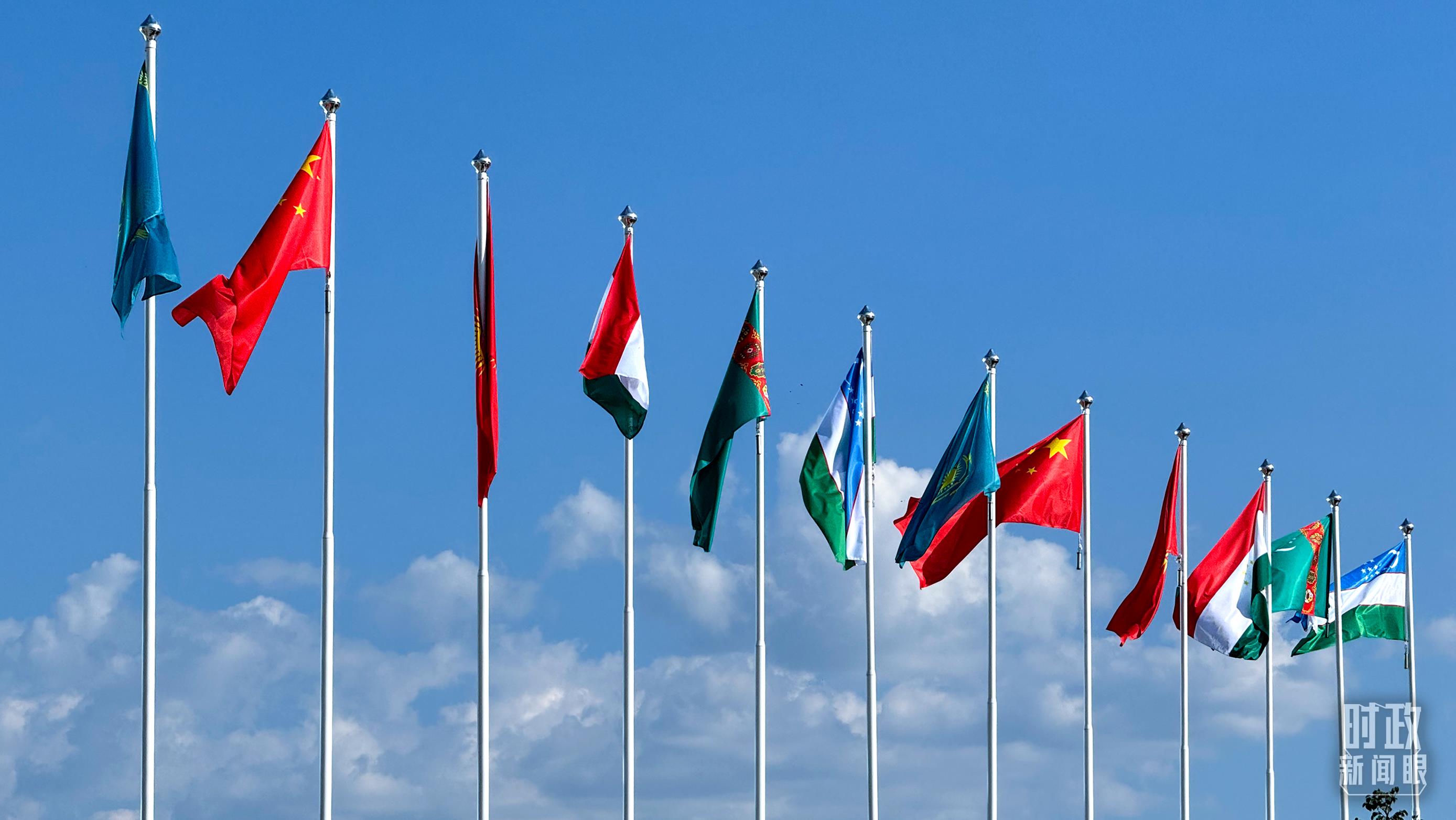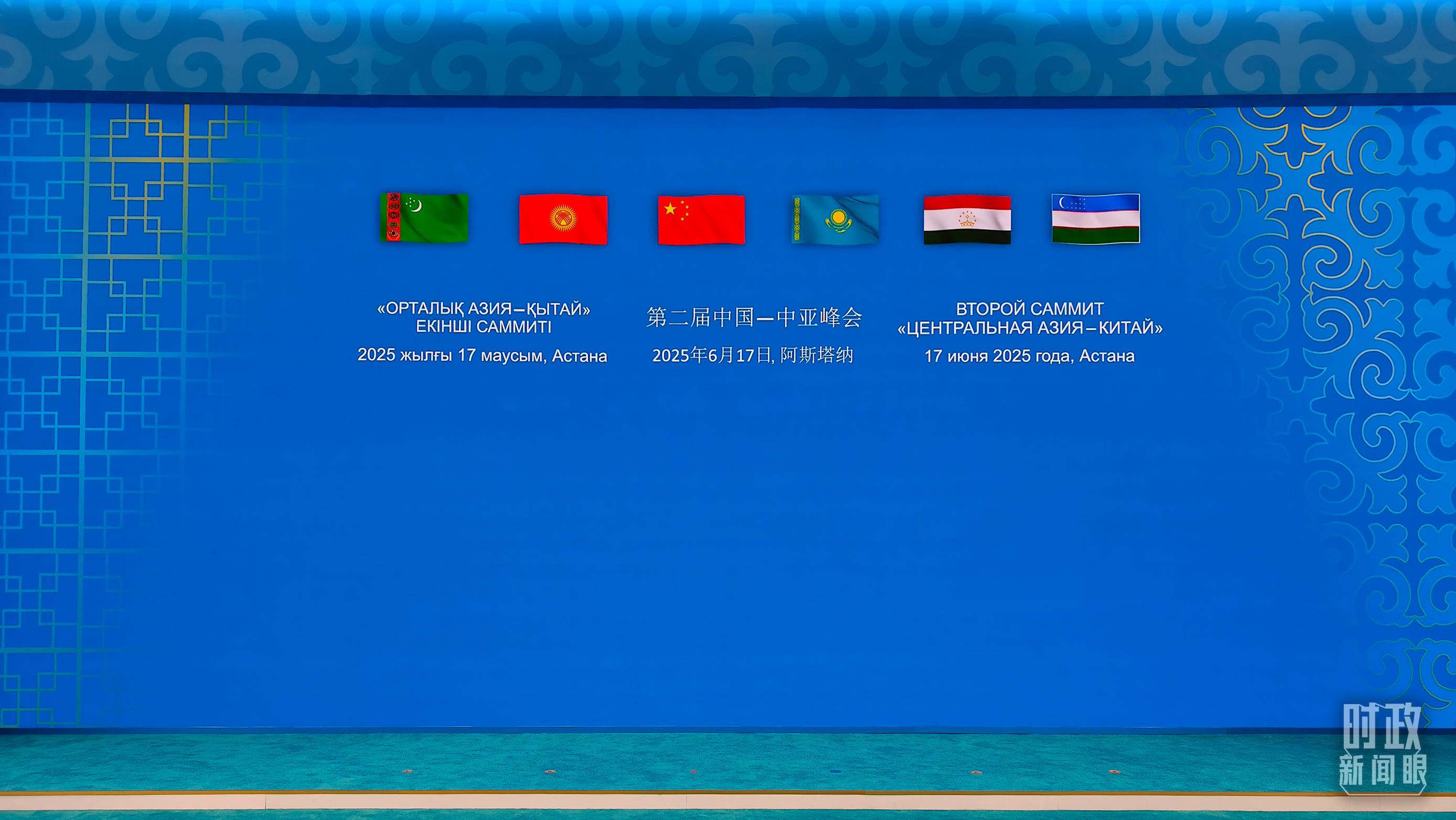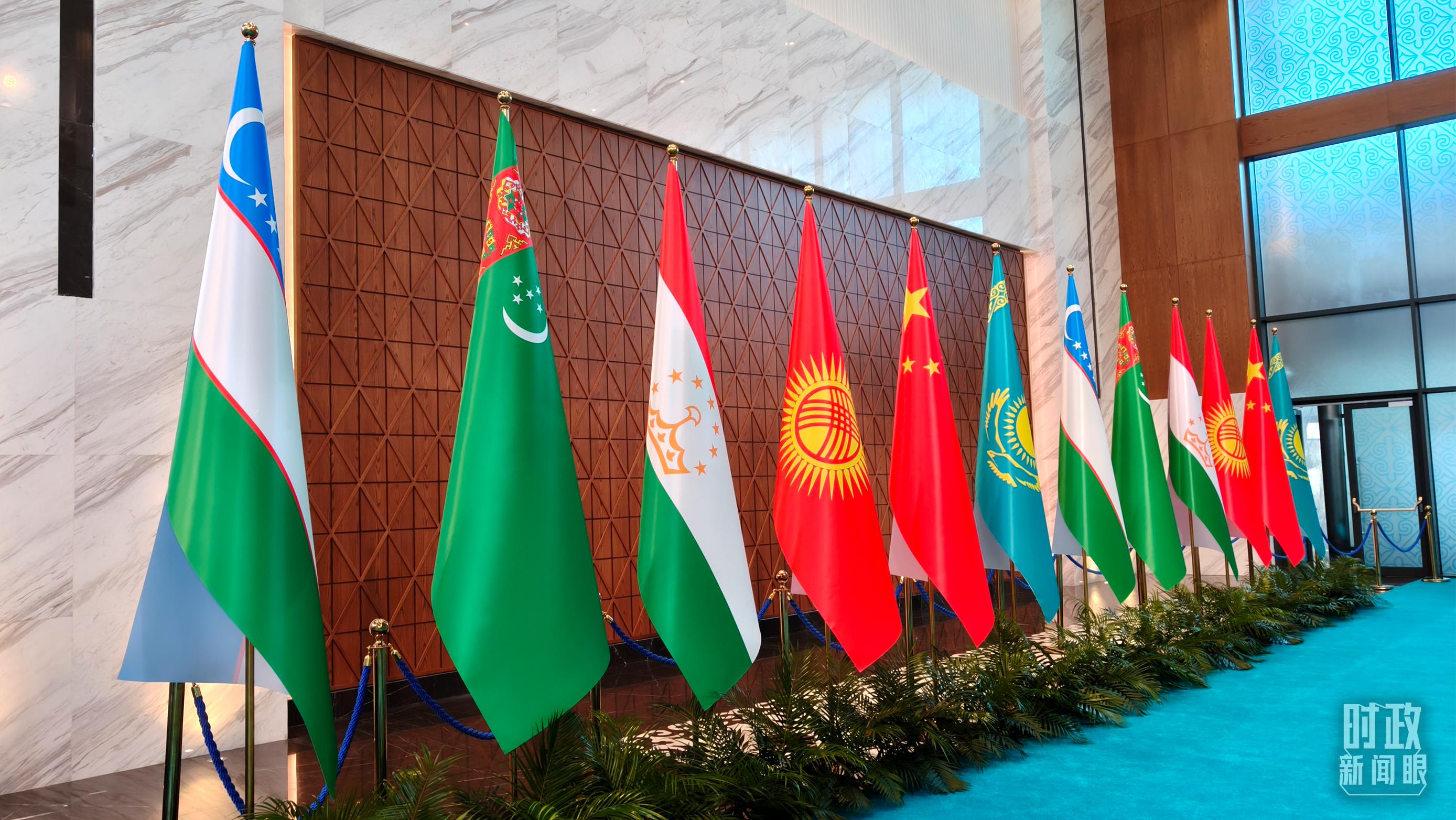 當地時間6月17日下午,阿斯塔納獨立宮前,各國旗幟迎風飄揚。習近平主席和中亞五國元首步入會場,集體合影后,六國元首圍坐圓桌前,共同擘畫中國—中亞機制發展的新藍圖。