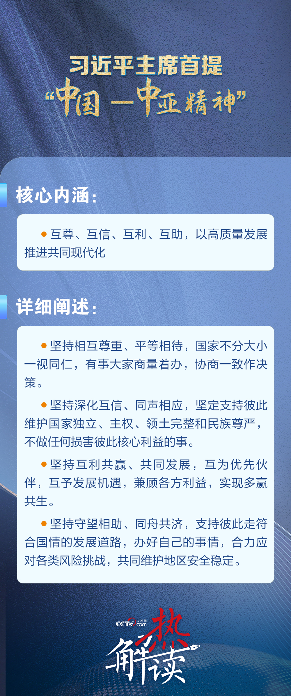 熱解讀 當地時間6月17日,習近平主席在哈薩克斯坦首都阿斯塔納出席第二屆中國—中亞峰會并作主旨發言,首次提出“中國—中亞精神”。