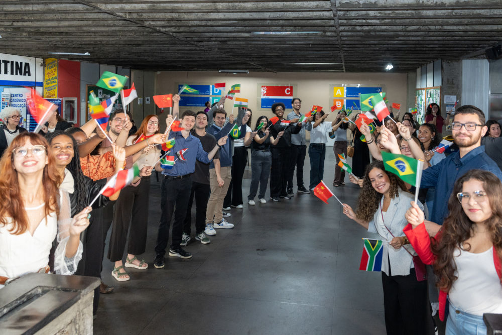 ??6月27日,巴西里約熱內盧州立大學的學生歡迎文明對話系列活動參會嘉賓到來。新華社記者王天聰攝