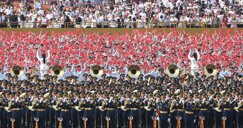 紀念大會開始前,天安門廣場上,千人聯合軍樂團演奏四首歌曲,合唱團唱響《松花江上》《在太行山上》《保衛黃河》《沒有共產黨就沒有新中國》。