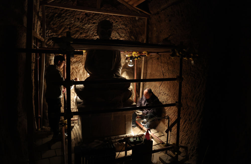 2024年11月2日,麥積山石窟藝術研究所保護研究室的文物修復師何舉在麥積山石窟133窟內修復塑像。近年來,麥積山石窟藝術研究所等文物保護部門持續加大對麥積山石窟的搶救性保護和預防性保護工作力度,積極探索現代科學技術手段與傳統文物修復技藝相結合的保護修復新路徑。截至目前,麥積山石窟已有80個洞窟完成整體保護修復工作。