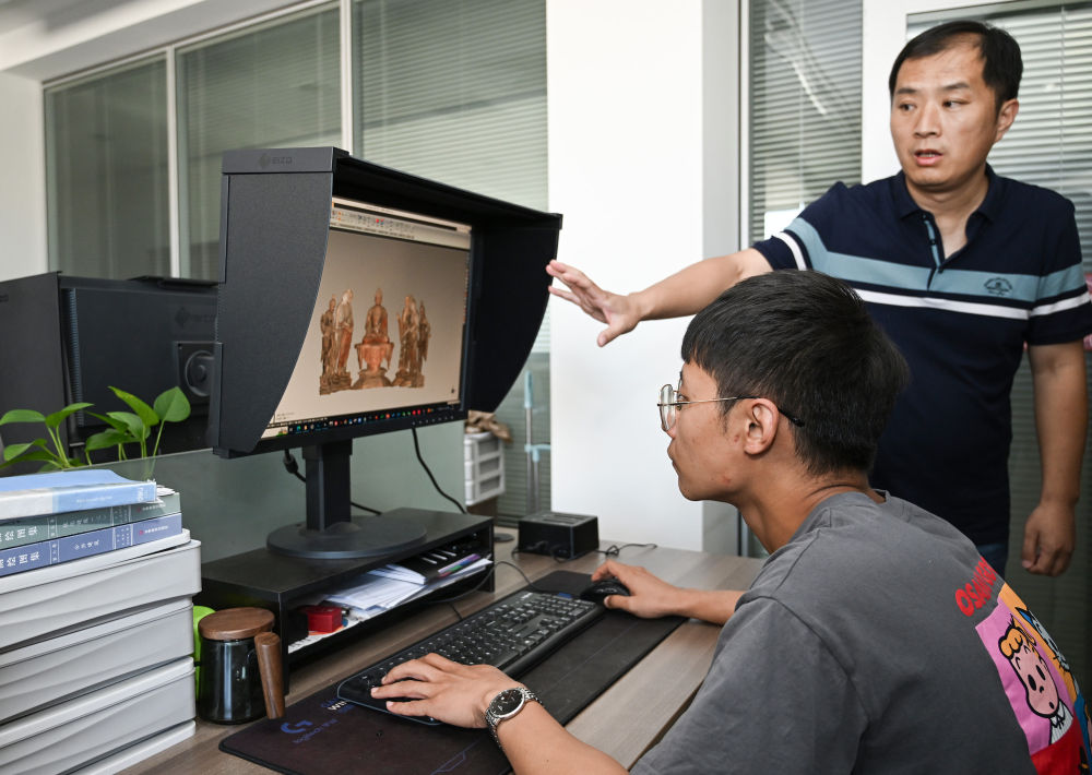 2023年8月3日,敦煌研究院文物數字化研究所的工作人員在展示莫高窟彩塑三維重建的成果。近年來,敦煌研究院持續加大文物保護基礎研究和應用研究,不斷加強文物科技保護力度,提升科研平臺建設,為文物保護和文化遺產事業發展奠定良好基礎。