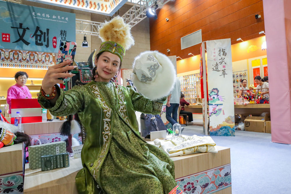2025年9月22日,游客在敦煌文博會上身穿民族服飾自拍。9月20日至22日,第八屆絲綢之路(敦煌)國際文化博覽會在敦煌市舉行。敦煌研究院“典范”“高地”建設成果展、甘肅文旅非遺文創展、敦煌·絲路雕塑展等多項展覽同步亮相,集中展現了敦煌文化遺產保護、研究、弘揚的最新成果以及共建“一帶一路”國家的文化藝術、非遺文創、風土人情等精彩內容。