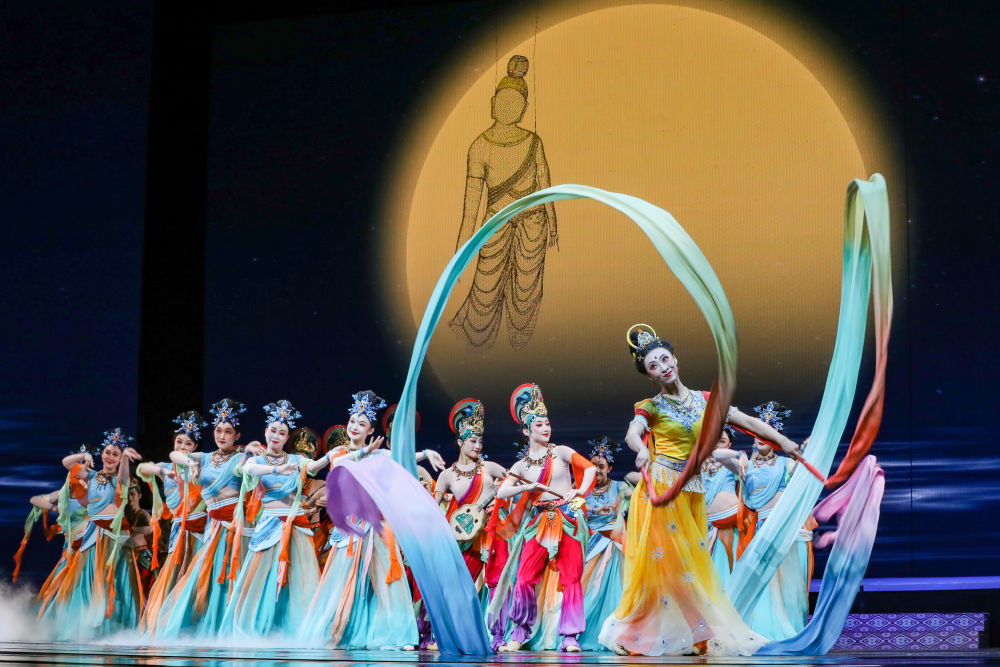2025年9月22日,在敦煌舉辦的“相約敦煌”國際文化交流演出活動上,甘肅省演藝集團的演員展演《樂動敦煌》選段。《樂動敦煌》借助對莫高窟壁畫、藏經洞古籍的解讀梳理,活化敦煌古樂器、古樂譜研發成果,通過全息投影等手段,結合專業演員的表演,將莫高窟壁畫中的樂舞盛景生動再現,讓觀眾沉浸式感悟傳承千年的敦煌樂舞文化魅力。
