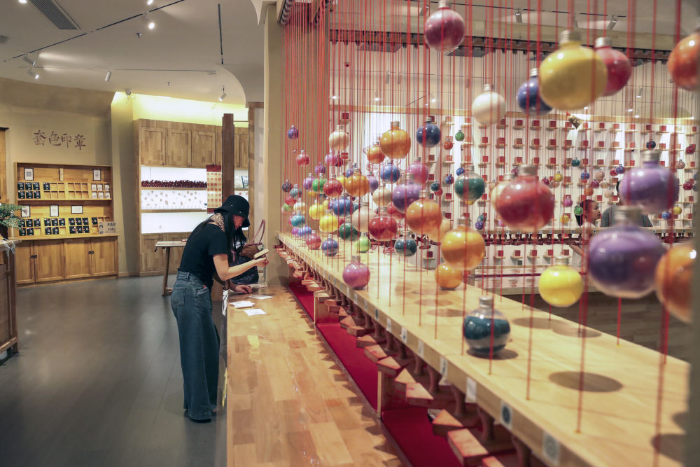 2025年5月10日,游客在敦煌文旅新打卡地敦煌印局體驗文創印章。