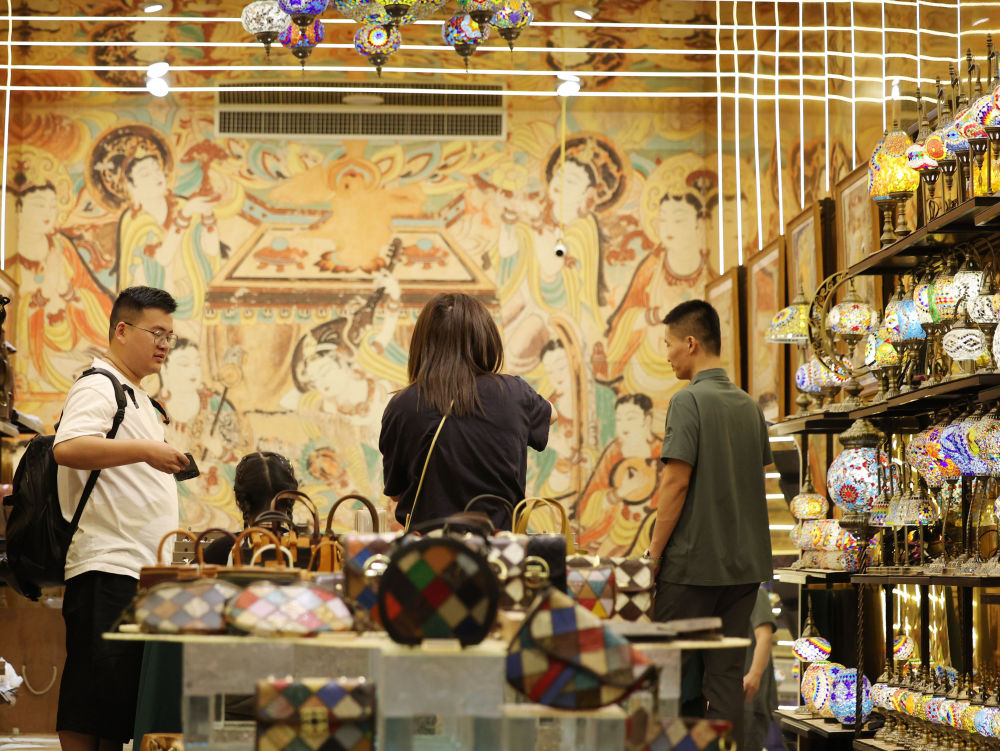 2025年6月26日,游客在敦煌夜市選購文創產品。今年以來,敦煌市全面改造敦煌夜市等特色街區,圍繞敦煌深厚的歷史文化底蘊,融入壁畫、絲路文化等元素,通過布設文化景觀小品、打造沉浸式餐飲體驗空間、上線特色文創產品等方式,給游客帶來多元體驗,“夜經濟”持續升溫,不斷釋放文旅消費潛力。