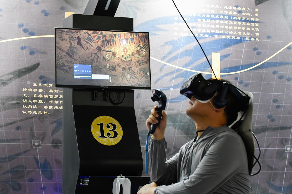 2024年7月22日,一名游客在敦煌莫高窟“尋境敦煌——數字敦煌沉浸展”上借助VR設備沉浸式游覽莫高窟第285窟虛擬場景。“尋境敦煌”綜合運用了VR虛擬現實、三維建模、游戲引擎的物理渲染和全局動態光照等新技術,高精度立體還原了莫高窟第285窟。游客戴上VR眼鏡,不僅可以零距離觀賞壁畫、360度自由探索洞窟細節,還能“飛升”到窟頂,身臨其境參與壁畫故事情節,沉浸式感受敦煌文化的魅力。